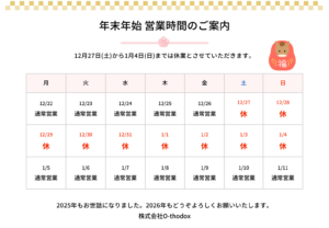 平素は格別のお引き立てを賜り、厚く御礼申し上げます。誠に勝手ながら、下記の期間を年末年始休業といたします。 休業期間中にいただきましたお問い合わせ・ご依頼につきましては、営業開始日以降、順次対応いたします。 何卒ご理解賜 […]